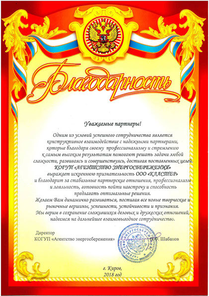 Выражает искреннюю признательность ООО «Кластер» и благодарит за стабильные партнерские отношения, профессионализм и лояльность, готовность пойти на встречу и способность предлагать оптимальные решения.