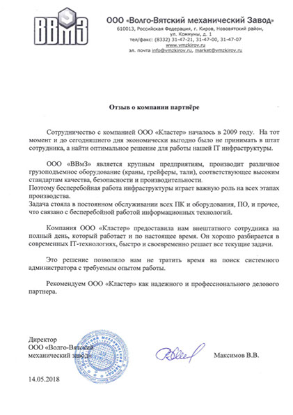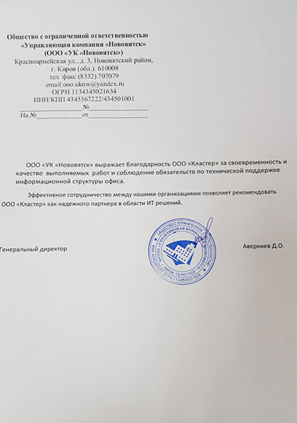 ООО «УК «Нововятск» выражает благодарность ООО «Кластер» за своевременность и качество выполняемых работ и соблюдение обязательств по технической поддержке информационной структуры офиса.